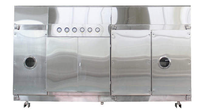 本機配有超聲波清洗網帶裝置(訂貨時定),並留(liú)有(yǒu)溫(wēn)度檢測口、塵(chén)埃粒子檢測(cè)口。本機可聯線或單機使用。