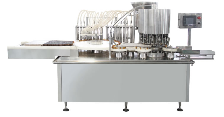 該(gāi)線采用觸摸屏動態顯示操作,PLC程(chéng)序控製;主機變頻調速。瓶子先經超聲波粗洗(xǐ),後由特製瓶鬥傳輸,經過九組工位內外壓力衝(chōng)洗後,進入高溫(wēn)隧道(dào)烘箱內滅菌、然後(hòu)轉(zhuǎn)入灌封機,由漸進式攔邊網帶進瓶、陶瓷泵跟蹤灌裝、柔性單刀或三刀滾壓跟蹤軋蓋、凸輪式收(shōu)瓶裝置等(děng)先進工序,自(zì)動化程度(dù)高。是(shì)口服液(yè)高產量新(xīn)型的理想設備。